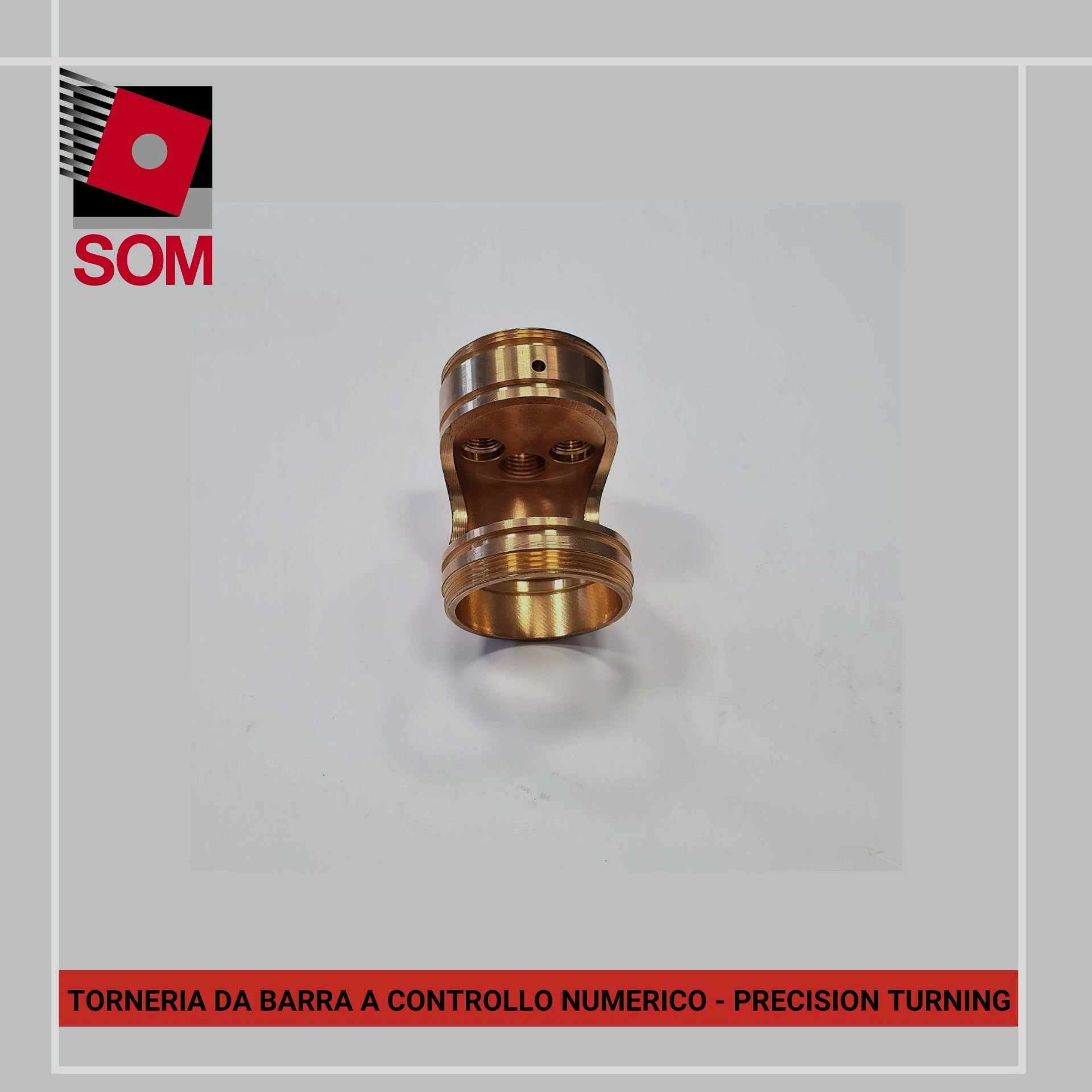 Attacco cartuccia miscelatore in lega di bronzo realizzato in un unico step di lavorazione. Svuotamento della parte centrale con il mantenimento del perfetto allineamento tra il supporto ceramico superiore e la parte filettata sottostante. Con 28 utensili in ciclo, 3 torrette e 2 mandrini in lavorazione simultanea si ottiene il pezzo finito senza alcuna operazione di ripresa. Si mantiene così con un costo competitivo l’assoluta precisione nell’esecuzione di tutte le lavorazioni. ...Miglioramento sempre!